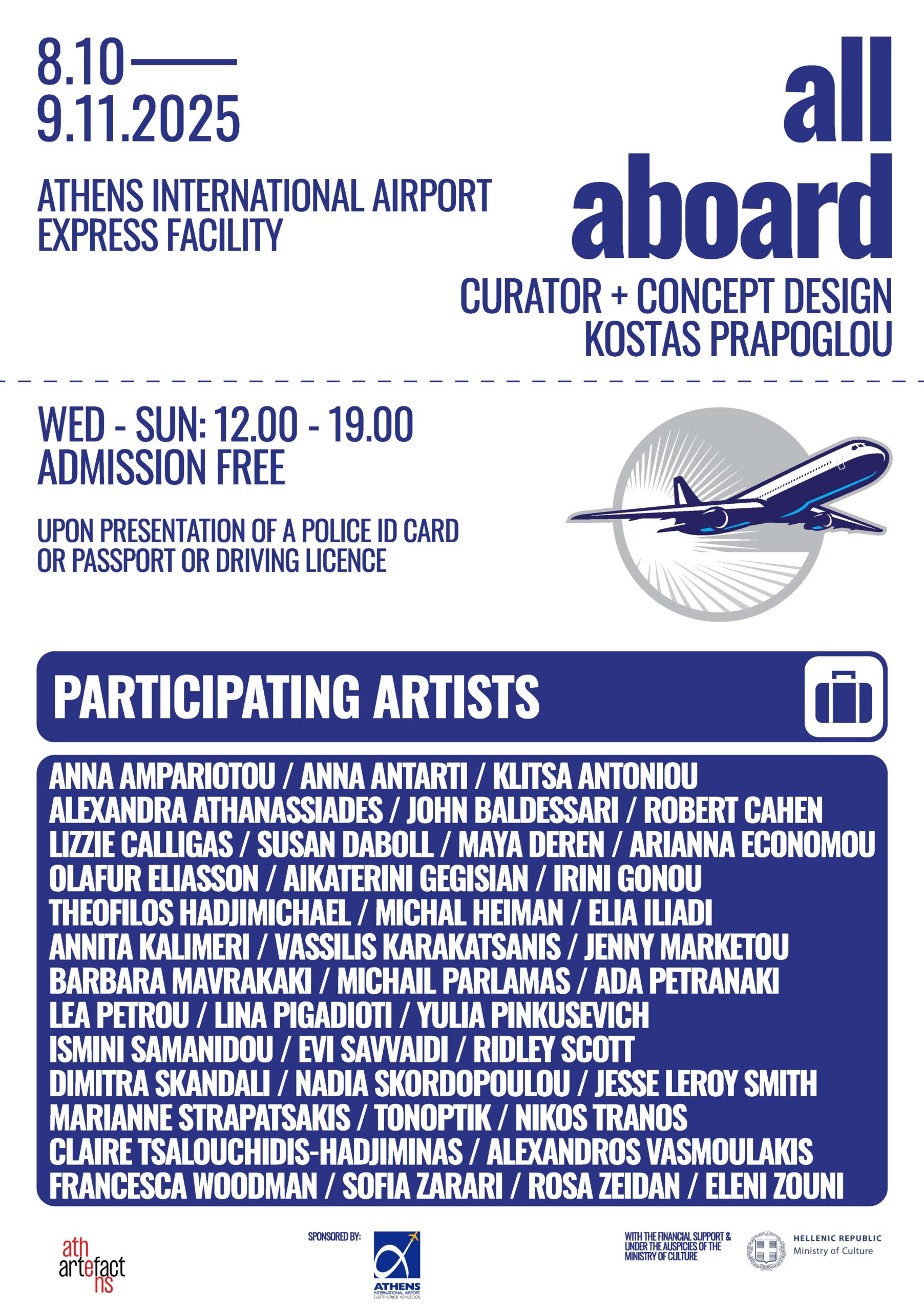 Ο αστικός μη κερδοσκοπικός οργανισμός artefact athens παρουσιάζει την έκθεση σύγχρονης τέχνης με τίτλο all aboard σε επιμέλεια Κώστα Πράπογλου που θα πραγματοποιηθεί στον Διεθνή Αερολιμένα Αθηνών «Ελευθέριος Βενιζέλος», από τις 9 Οκτωβρίου έως τις 9 Νοεμβρίου 2025.