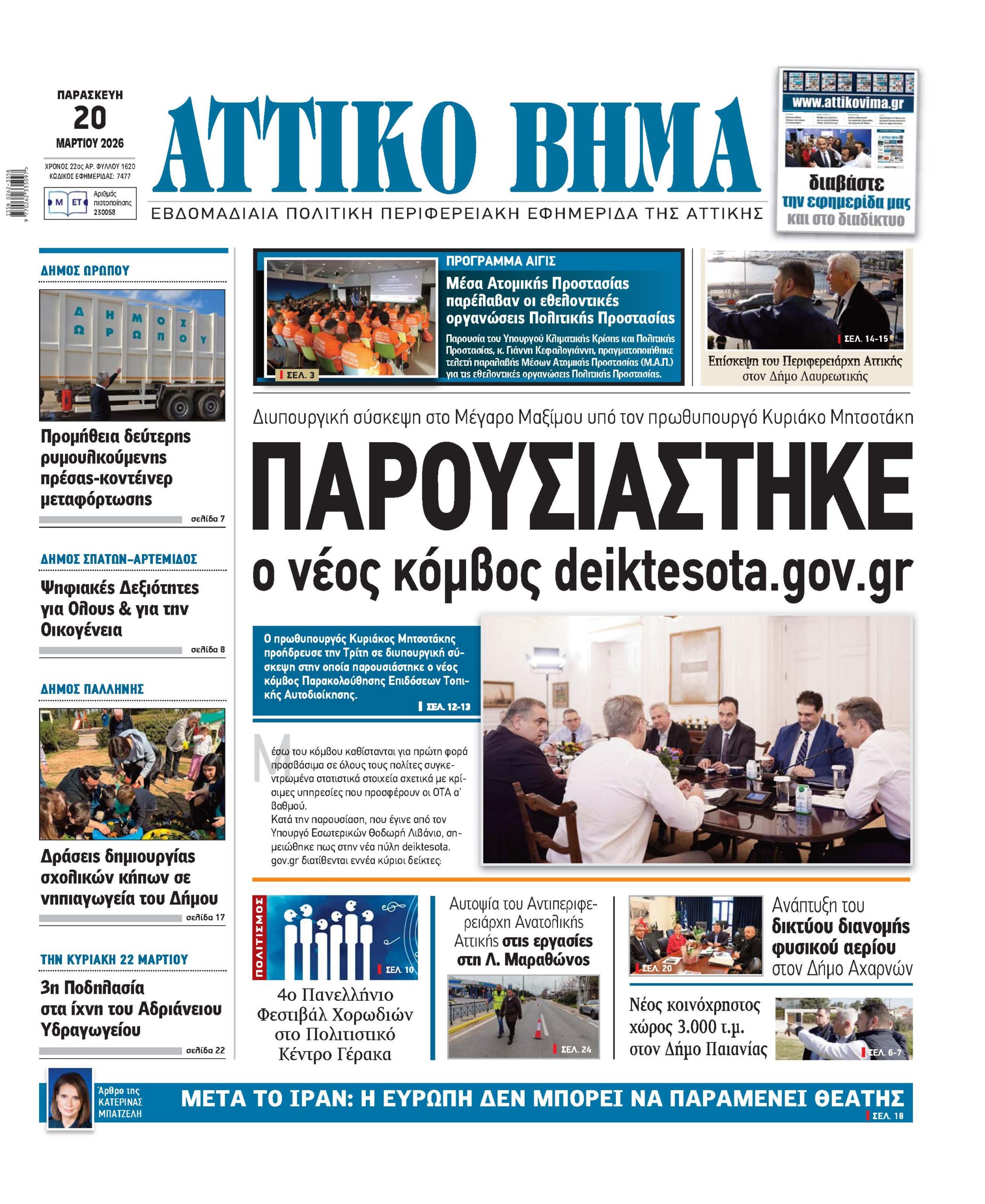 | Μέσω του κόμβου καθίστανται για πρώτη φορά προσβάσιμα σε όλους τους πολίτες συγκεντρωμένα στατιστικά στοιχεία σχετικά με κρίσιμες υπηρεσίες που προσφέρουν οι ΟΤΑ α’ βαθμού. | Κατά την παρουσίαση, που έγινε από τον Υπουργό Εσωτερικών Θοδωρή Λιβάνιο, σημειώθηκε πως στην νέα πύλη deiktesota.gov.gr διατίθενται εννέα κύριοι δείκτες: για την οικονομική λειτουργία των Δήμων, την κοινωνική προστασία που παρέχουν, την προσχολική αγωγή και τις παιδικές δομές, τον πολιτισμό, τη βιώσιμη κινητικότητα, τη διαχείριση απορριμμάτων, την πολιτική προστασία, τη διαχείριση αδέσποτων ζώων και την ψηφιακή ωριμότητα. | Κάθε ενότητα περιλαμβάνει σειρά επιμέρους υποδεικτών, με αποτέλεσμα να έχει καταρτιστεί για πρώτη φορά μία πανελλαδική βάση δεδομένων που υπηρετεί τόσο τη διαφάνεια όσο και τη χάραξη πολιτικής, με βάση τις πραγματικές και καταγεγραμμένες πλέον ανάγκες κάθε τοπικής κοινωνίας. Τα δεδομένα αποτυπώνουν, σε πρώτη φάση, την κατάσταση το έτος 2024, το οποίο αποτελεί και έτος βάσης για σύγκριση με επόμενες χρονιές που θα προστεθούν μελλοντικά. |