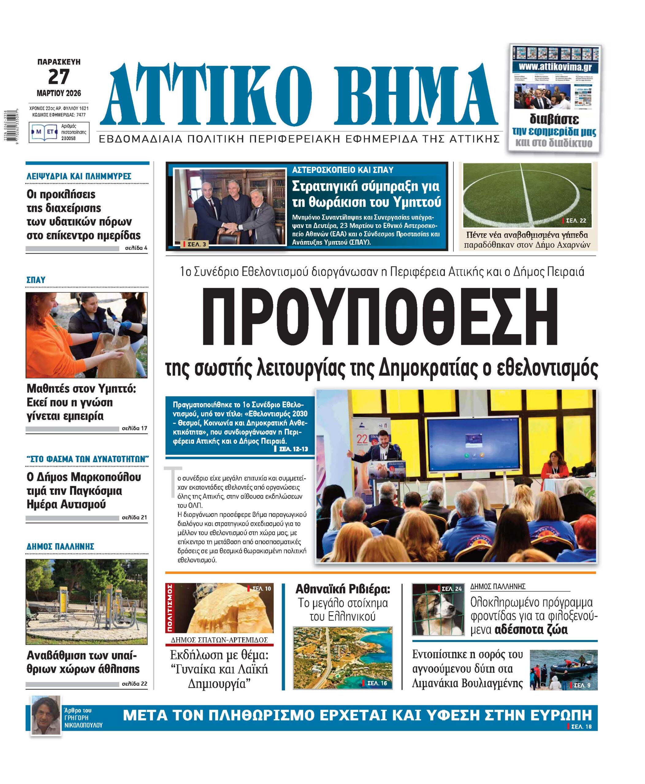 Πραγματοποιήθηκε το 1ο Συνέδριο Εθελοντισμού, υπό τον τίτλο: «Εθελοντισμός 2030 - Θεσμοί, Κοινωνία και Δημοκρατική Ανθεκτικότητα», που συνδιοργάνωσαν η Περιφέρεια Αττικής και ο Δήμος Πειραιά.