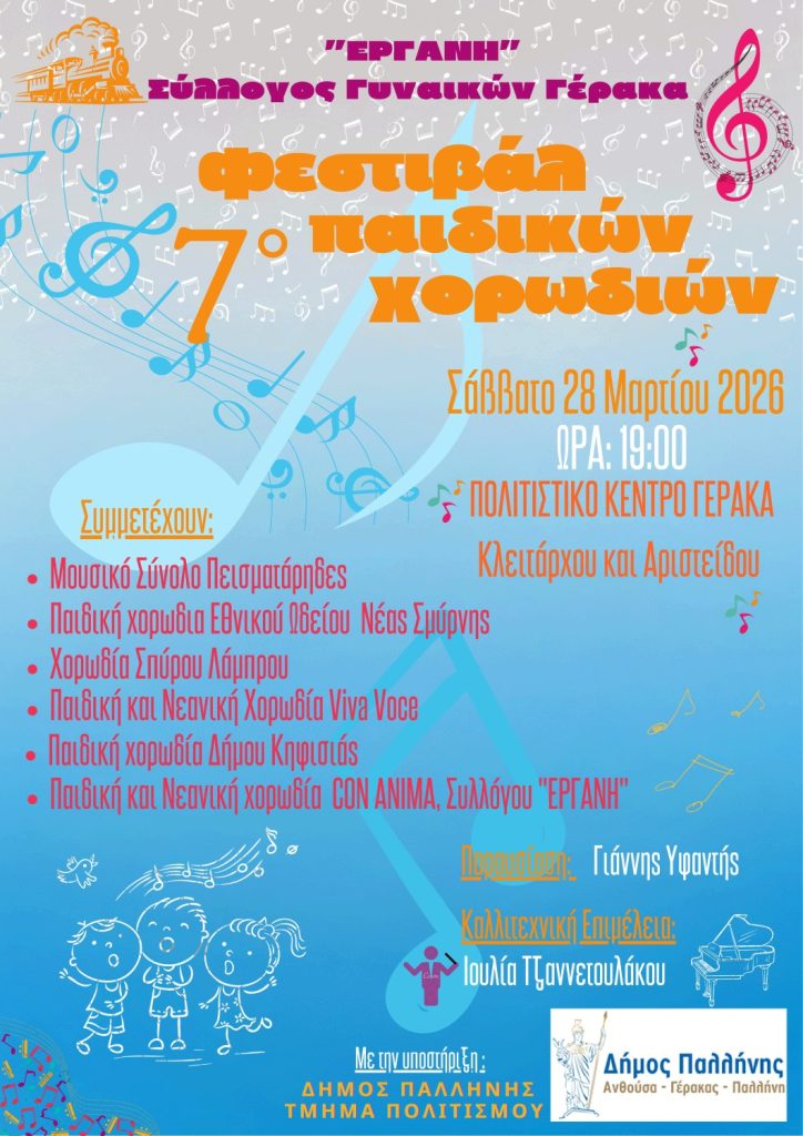 Ο Σύλλογος Γυναικών Γέρακα «Εργάνη» διοργανώνει το 7ο Φεστιβάλ Παιδικών Χορωδιών. Μια ξεχωριστή μουσική εκδήλωση αφιερωμένη στη δύναμη της παιδικής και νεανικής φωνής, υπό την αιγίδα του Δήμος Παλλήνης και με τη στήριξη του Τμήματος Πολιτισμού.