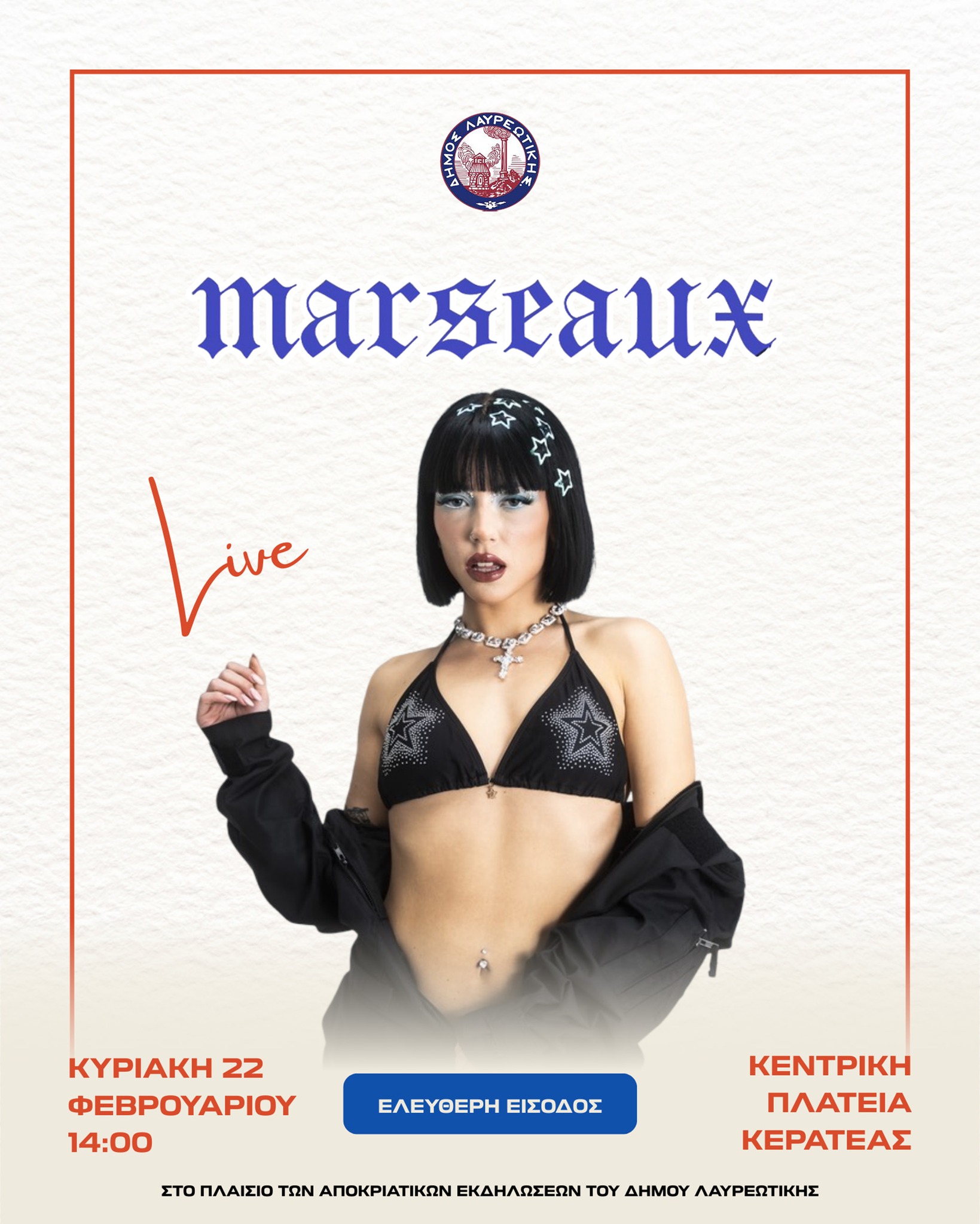 Ο Δήμος Λαυρεωτικής σας προσκαλεί σε μια ξεχωριστή αποκριάτικη συναυλία με τη Marseaux, την Κυριακή 22 Φεβρουαρίου στις 14:00, στην Κεντρική Πλατεία Κερατέας. Μια δυναμική μουσική εμπειρία γεμάτη ρυθμό, ενέργεια και αγαπημένες επιτυχίες, στο πλαίσιο των αποκριάτικων εκδηλώσεων του Δήμου.