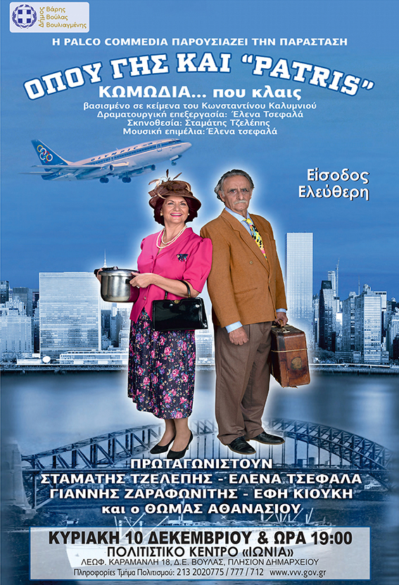 Η παράσταση «Όπου Γης και Patris» είναι βασισμένη σε κείμενα του πολυγραφότατου Έλληνο-Αυστραλού συγγραφέα Κωνσταντίνου Καλυμνιού. Το έργο είναι σπονδυλωτό. Αποτελείται από τέσσερις ιστορίες που κινούνται στον ίδιο άξονα, τη σχέση του Έλληνα μετανάστη με την Μάνα Ελλάδα, καθώς και τη βαθιά ανάγκη του να «ριζώσει» στη νέα του πατρίδα. Η σκηνοθεσία είναι του Σταμάτη Τζελέπη και οι ηθοποιοί της παράστασης είναι: Σταμάτης Τζελέπης, Έλενα Τσεφαλά, Γιάννης Ζαραφωνίτης, Έφη Κιούκη και ο Θωμάς Αθανασίου.