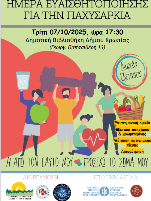 Ο Δήμος Κρωπίας, το ΚΕΠ Υγείας και το Ελληνικό Διαδημοτικό Δίκτυο Υγιών Πόλεων του Π.Ο.Υ. (ΕΔΔΥΠΠΥ) διοργανώνουν τη δράση: «Ημέρα Ευαισθητοποίησης για την Παχυσαρκία», την Τρίτη 7 Οκτωβρίου και ώρα 17:30 στη Δημοτική Βιβλιοθήκη Δήμου Κορωπίου(Οδός Ολυμπιονίκη Γεωργίου Σαράντη Παπασιδέρη 13, πεζόδρομος).