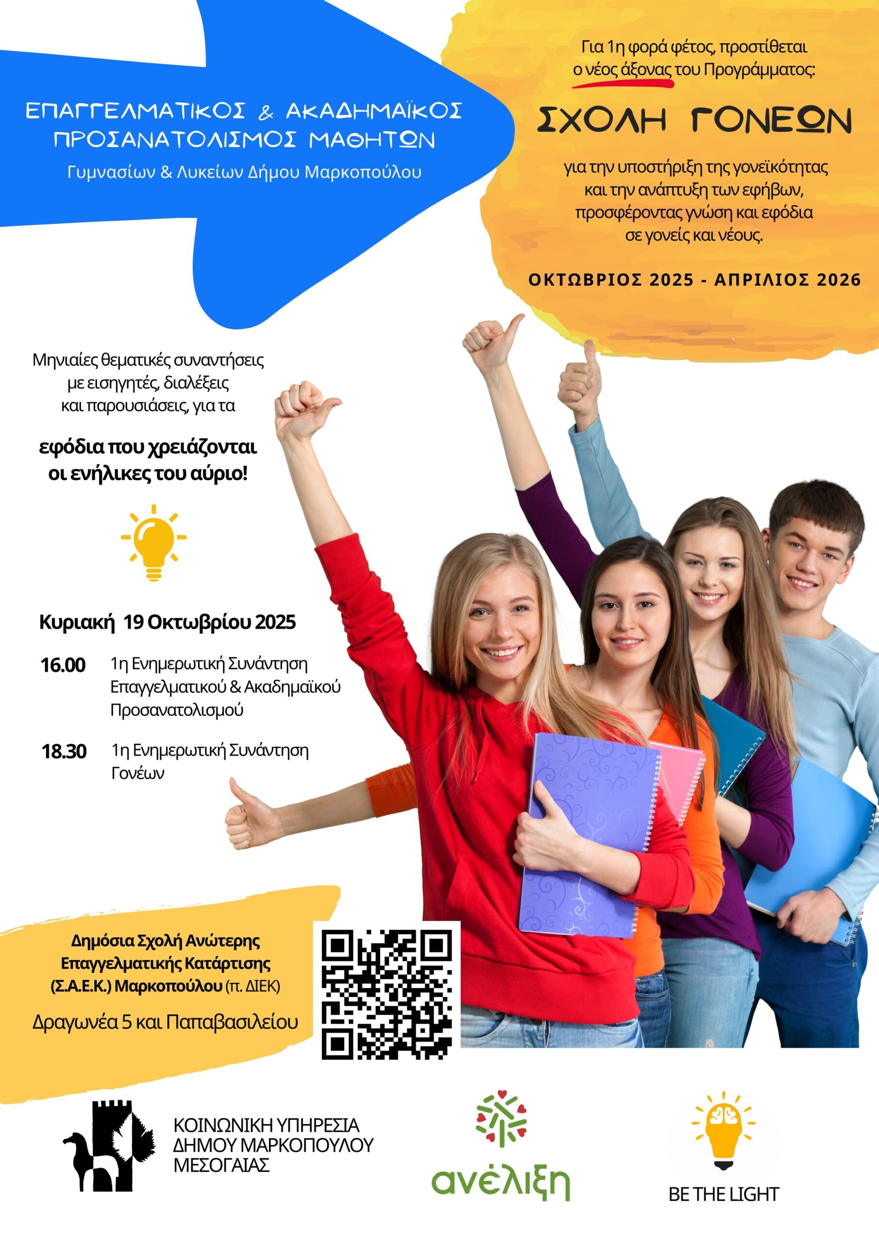 Οι συναντήσεις με την «Ανέλιξη», τόσο για τον επαγγελματικό και ακαδημαϊκό προσανατολισμό των εφήβων μαθητών, όσο και για την σχολή Γονέων, θα πραγματοποιούνται μια Κυριακή κάθε μήνα από τον Οκτώβριο 2025 έως τον Απρίλιο 2026.